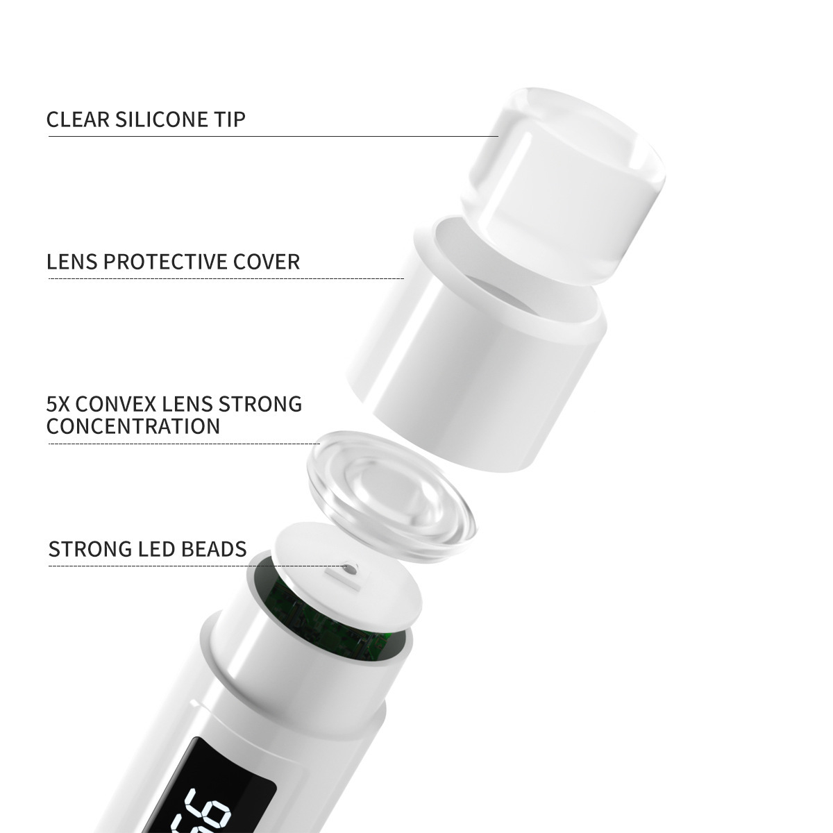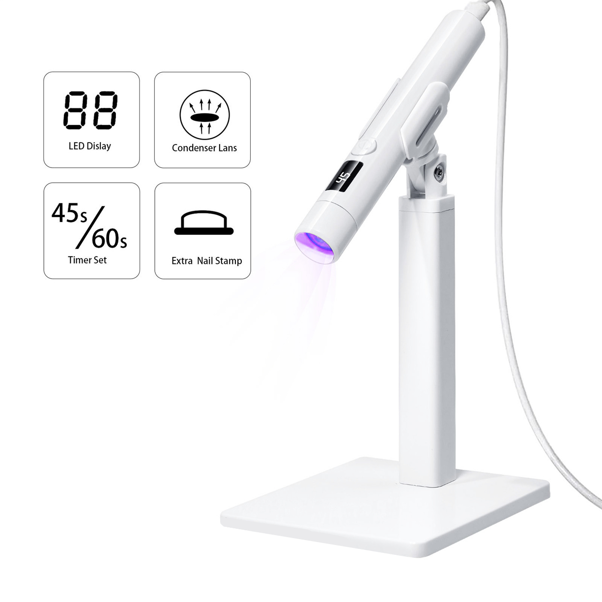 Grazie alla combinazione di sfere luminose a LED da 365 + 405 nm e alla tecnologia delle lenti di alta qualità, la lampada garantisce una polimerizzazione uniforme, veloce e sicura da tutte le angolazioni, senza irritare la pelle.